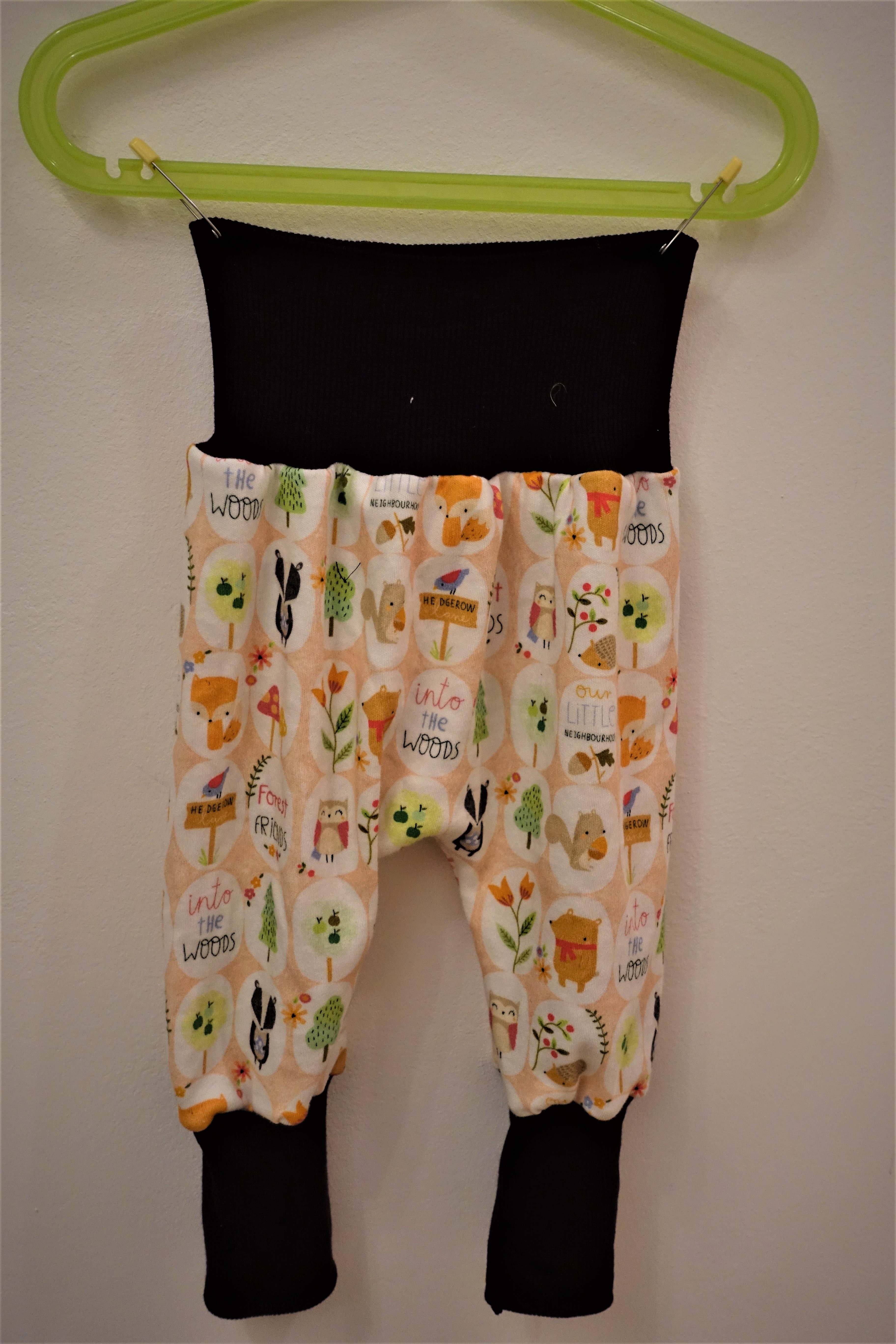 As I wanted to make a pair of harem pants like other mothers dressed their babies in in my post-natal gymnastics class, I wanted them to be fun, playful and bold, which is typical to modern baby fashion. I bought a deep purple jersey to make the waist and ankel bands to contrast the lightness of the pants and play up a cute little black skunk that stood out on the pant pattern.